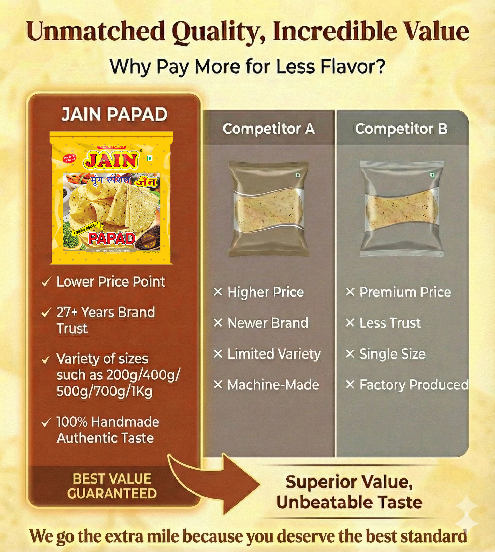 - NO PRESERVATIVES : No Preservatives Used at Any Stage – Just Traditional Handcrafted Papad Made with Jain’s Homely Care & Utmost Hygiene